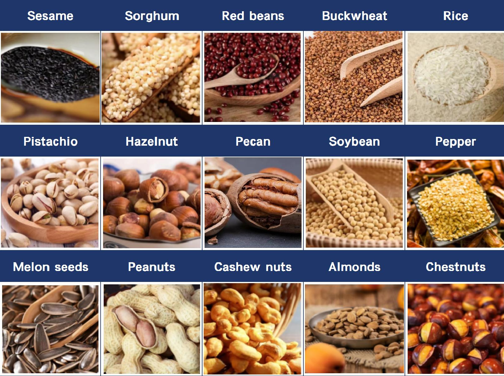 Leisure food industry: melon seeds, peanuts, cashew nuts, almonds, chestnuts, walnuts, etc.