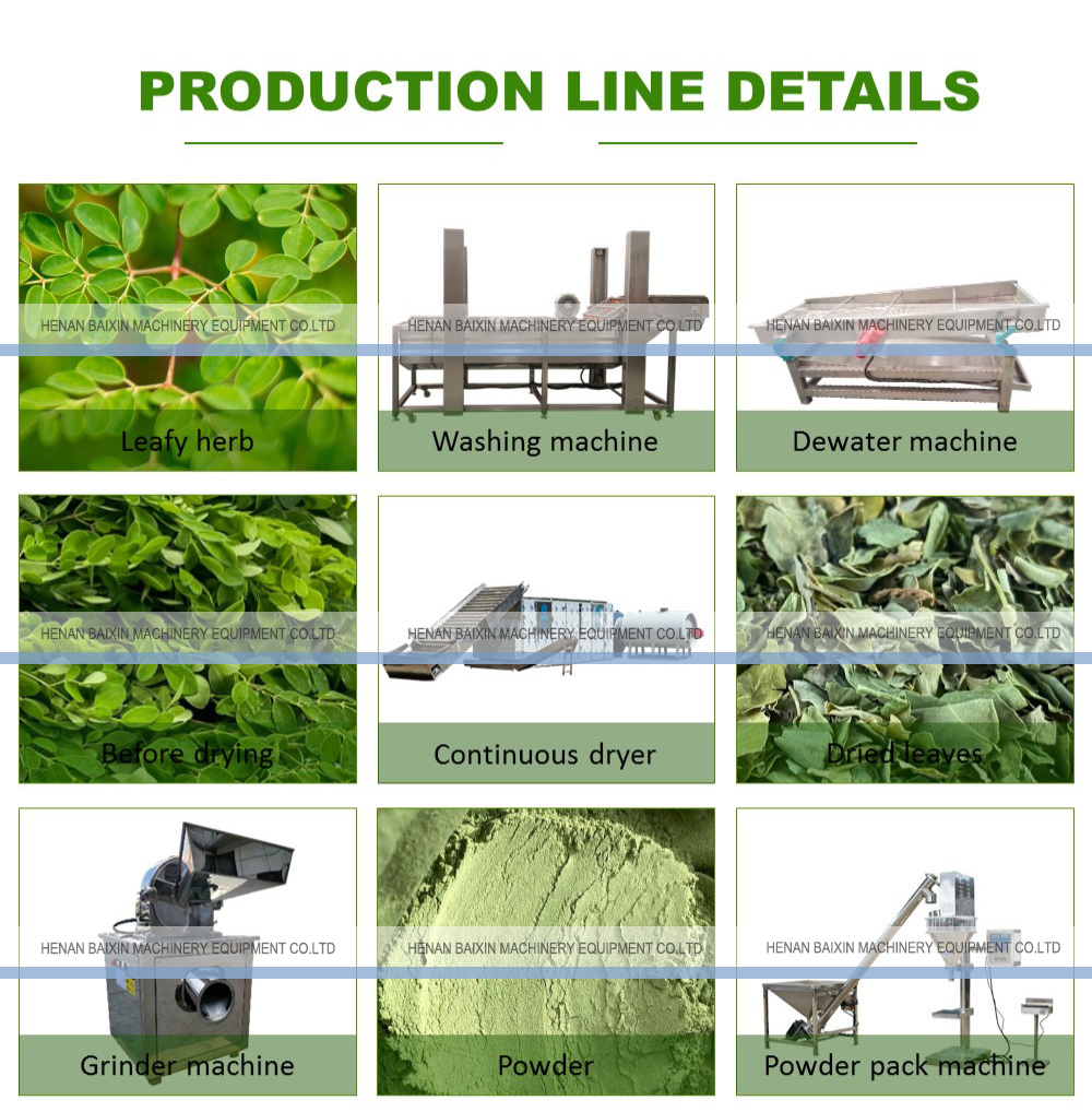 Washing machine: The principle of the bubble cleaning machine is to use the front part of the equipment box to inject an appropriate amount of water into the equipment box, When the raw materials pass through the box, they will tumble under the combined action of the bubble machine and water, and As the mesh belt continues to advance, when it comes out of the water, there is a sprinkler head at the high end for high-pressure flushing. Vibrating dewater machine:The vibrating machine is driven by a motor, and the vibration damping spring causes the screen surface to perform regular mechanical vibration, there by removing the surface moisture of the material, which is convenient for the next process of processing the material. The vibratory draining equipment has absorbed the advantages of foreign countries, incorporated a variety of new technologies and processes, has the characteristics of wide processing versatility, low investment, energy saving, and good treatment effects. Drying machine: The dryer is the key equipment, which determines the effect and quality of herb after processing.Using our mesh belt type banana dryer, with an intelligent control system, can make banana drying is always maintained in a reasonable drying environment to ensure the effect of the finished product.The use of this herb dryer has the advantages of large processing output, high degree of automation, controllable drying effect and quality, and rapid drying time. Flexible heat source selection: Coal, wood chips, natural gas, diesel, propane, electricity, steam can be used for the dryer etc. Herb powder making machine: Grind dehydrated banana chips to a fineness of 40-120 mesh, or even finner. The banana grinder is air-cooled or water-cooled and can work continuously for a long time. Herb powder packaging machine: Generally speaking,banana powder business requires automatic banana powder packaging equipment.The banana powder packaging machine has a PLC control system, which is intelligent and controllable, and can be quickly adjusted according to customer packaging requirements. Packaging weight and quantity are automatically adjusted.