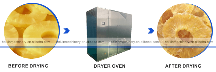 Baixin pineapple heat pump dryer oven is adopts medium and low temperature for drying,It is suitable for drying a very large variety of food that drying temperature lower than 80℃. Its several advantages than traditional heat pump dryer. 1, Energy-saving. 2, All in one type struction, no need installation, only need to connect it to power supply to use. 3, High grade fingerless stainless steel magnetic door, open easily. 4, Parallel penetration of strong wind, good drying effect, even drying. 5, Intelligent drying and touch screen operation. 6, No external parts, can be moved to anywhere in any time, move freely. We are dedicated to the field of drying equipment for 11 years, having the accumulated experience of over 100 materials. Please refer to the following parameters for BX-3P-K model, we have different options for your choose and we can also customize it according to your requirements Product details The pineapple hot air dryer absorbs the heat in the air outside the drying room through the evaporator, transfers it to the drying room through the refrigerant and the compressor, heats the air in the room, the hot air goes through the material, and takes away the moisture, It is discharged outside the room through a moisture removal device (humidity exhaust fan or air valve) to achieve drying. Consume 1kw electrical energy to transfer 3kw heat energy,you can get 4kw heat energy. 1kw electrical energy=4kw heat energy More options