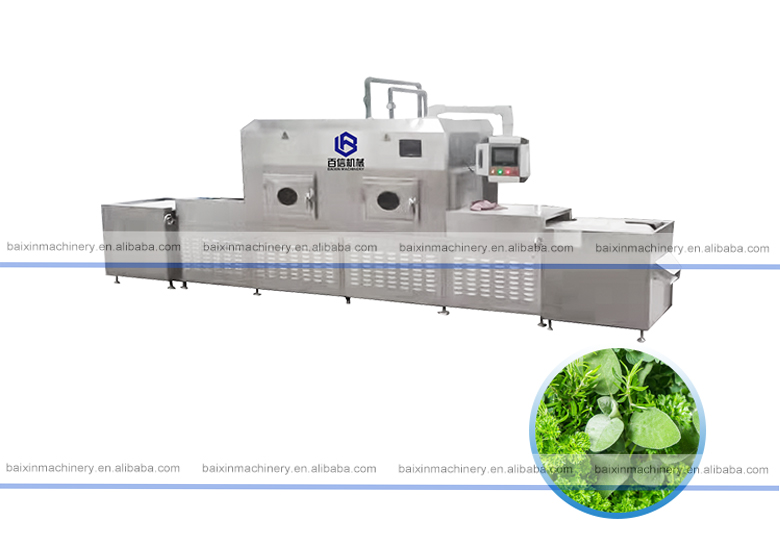 Herb Microwave drying sterilizing equipment, also known as microwave sterilizer dryer, is a microwave machine used to sterilize food, medicinal materials, fruits,vegetables, cardboard and other materials. Compared with traditional sterilizing equipment, the characteristics of microwave sterilizing equipment are: Fast sterilizing rate, high efficiency, environmental protection and energy saving. Its working principle is that microorganisms in food are simultaneously affected by the thermal effect and non-thermal effect of microwaves, causing their proteins and physiologically active substances to mutate, resulting in delayed growth and death of microorganisms, and the purpose of food sterilization and preservation.