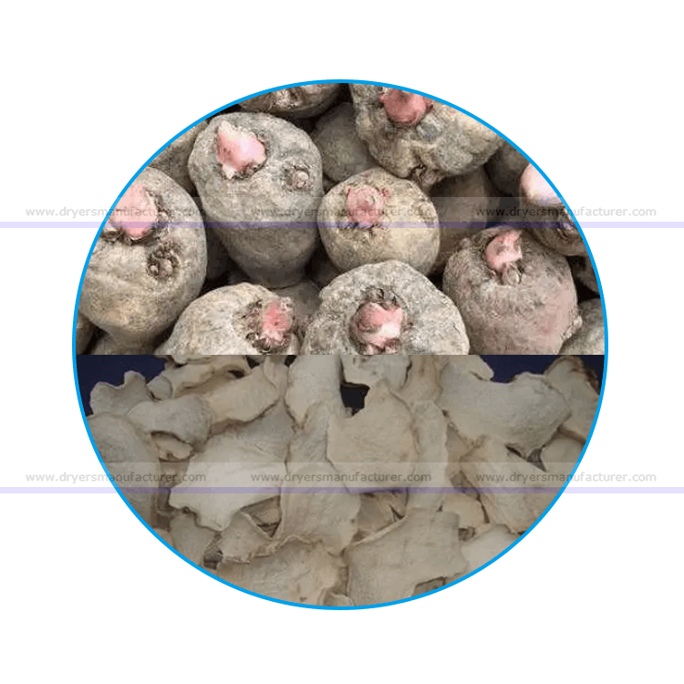 The drying curve of konjac chips is complex. The drying process needs to be dried in three sections: high, medium and low temperature. The baking time is 15-20 hours, and the moisture content of the finished product is below 13%.